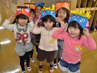 今年度、幼稚園で一番多い1月生まれのお友達をみんなでお祝いしました。誕生会後のお楽しみの時間はエプロンシアター『ピーマンマンとかぜひきキン』でした。 |