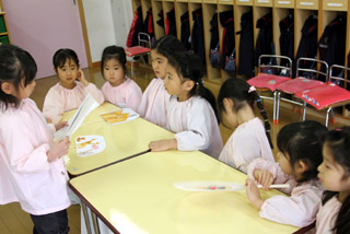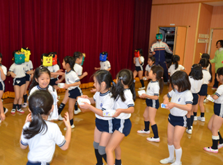 各組ごとに、順番で鬼役と豆まき役を決め、「鬼は外、福はうち」とお互いに元気よく豆まきをしました。鬼のお面を被った先生が登場すると、みんなで力を合わせて豆をまき、自分の心の中にいる鬼を退治しました。 |