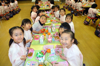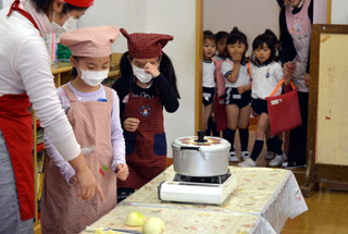 年長組の全員が楽しみにしているお料理教室。3回目の今回はカレーを作りました。年少組も興味津々、廊下から見せてもらいました。 |