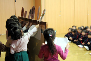 年長組が幼稚園生活の総まとめとして、年少と年中組のお友だちに「桃と太郎」と「オズの魔法使い」のペープサートを披露しました。 |
