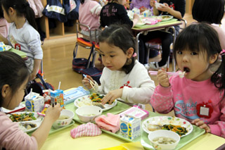 ちらし寿司、さわらの西京焼き、青菜のお浸し、すまし汁、牛乳、そして桜餅。桜の葉の塩漬けは苦手だけれども、桜餅は大好きと嬉しそうに話す園児もみられました。 |