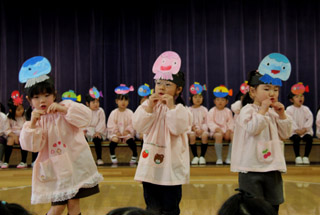 一生懸命セリフや振付を覚え、年少組は劇遊び「やさいのパティ―おおさわぎ」、年中組はオペレッタ「くらげのおつかい」をお姉さん達の前で披露しました。 |