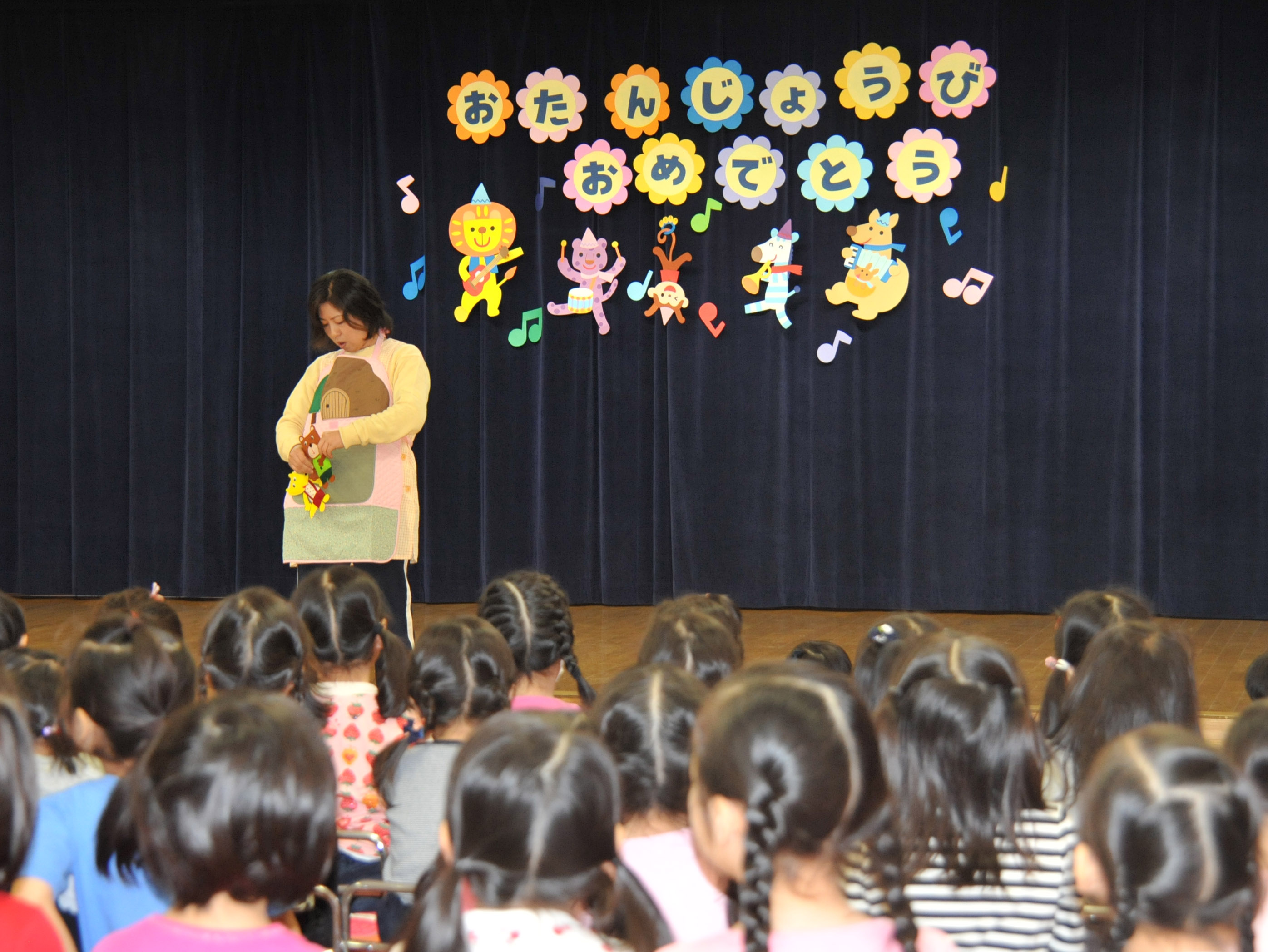 4月生まれのお友達をお祝いしました。誕生会後のエプロンシアターは「くまどんときつねどん」。優しい気持ちでお友達と遊ぼうと思いました。 |