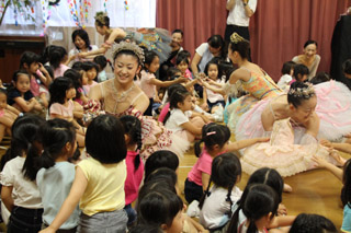 ワークショップで、子どもたちは、バレエの衣装やトゥシューズ、ティアラを間近で見たり、みんなで踊ったり、バレエの世界を体験することができました。 |