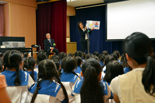 目白警察署の方から、自分の「いのち」を守るためのお話をDVDとクイズ形式で確認し、最後に、助けを求めるために「助けて!」と大きな声を出す練習をしました。 |