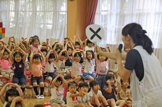夏休みに入るため、ひと月早く8月のお誕生会をしました。「お楽しみ」は〇×クイズと盆踊り。〇×クイズでは先生や幼稚園の秘密に、みんなが盛り上がりました。 |