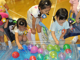 まとあて、輪なげ、ヨーヨーつり、サッカーゲーム、風船ランドのお店が並びました。初めて参加する年少さんは、年長さんのお姉さんに遊び方を教えてもらいながら楽しみました。 |