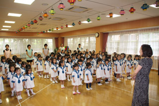 副園長先生から「けがや病気をしないように、また、早寝早起き、好き嫌いなくしっかり食事をするなど、夏休みも健康に過ごしましょう。」と話がありました。 |