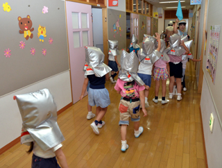 夏休み前にひと月早く、8月のお誕生会をしました。今回のお楽しみは、一人ペープサート「ねこざかな」を鑑賞しました。 |