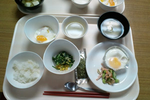 | 朝食はベーコンエッグ、ツナサラダ、ほうれん草のバター炒め、焼き海苔に味噌汁、ごはん、杏仁豆腐でした。 |