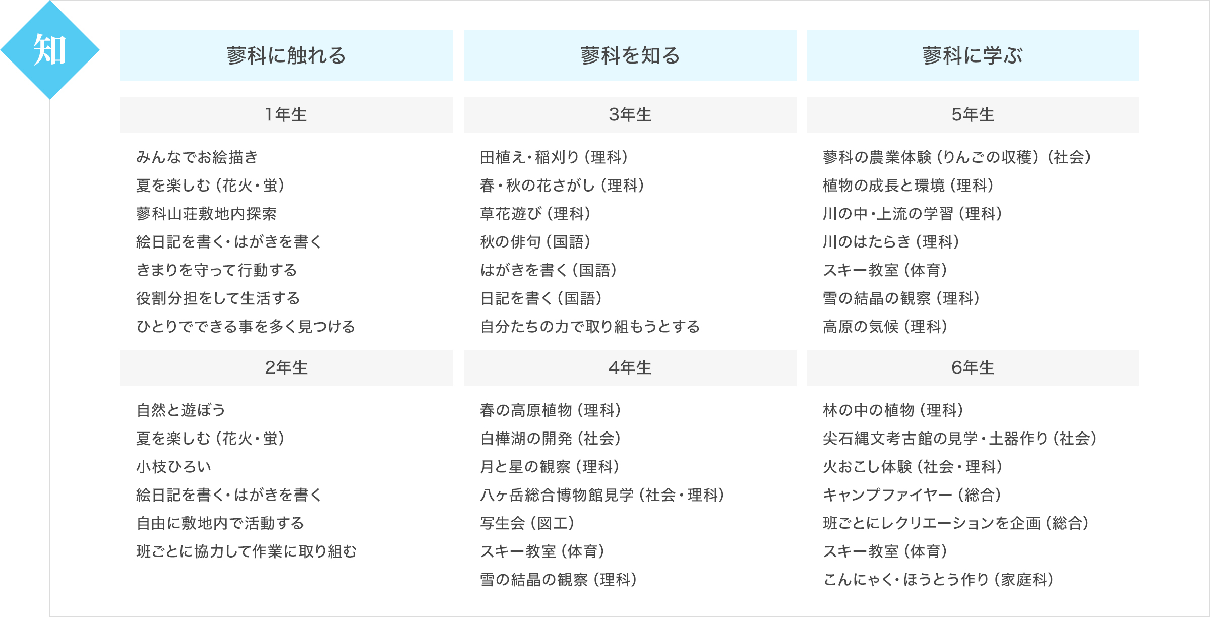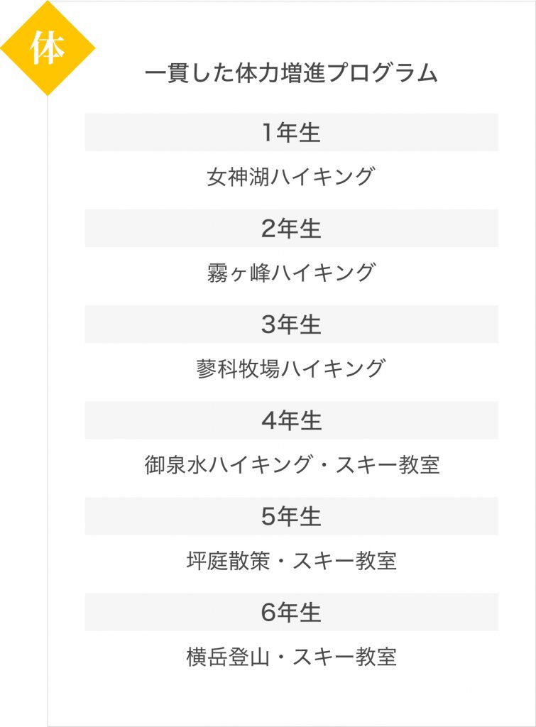 蓼科のフィールドワークで、たくさんの刺激を受け、物事を探求し、自ら進んで取り組む学習形態は、アクティブラーニングそのものです。大自然の中、四季を体感しながら生まれる豊かな人間性、社会性、友情、自然への慈しみを育てます。