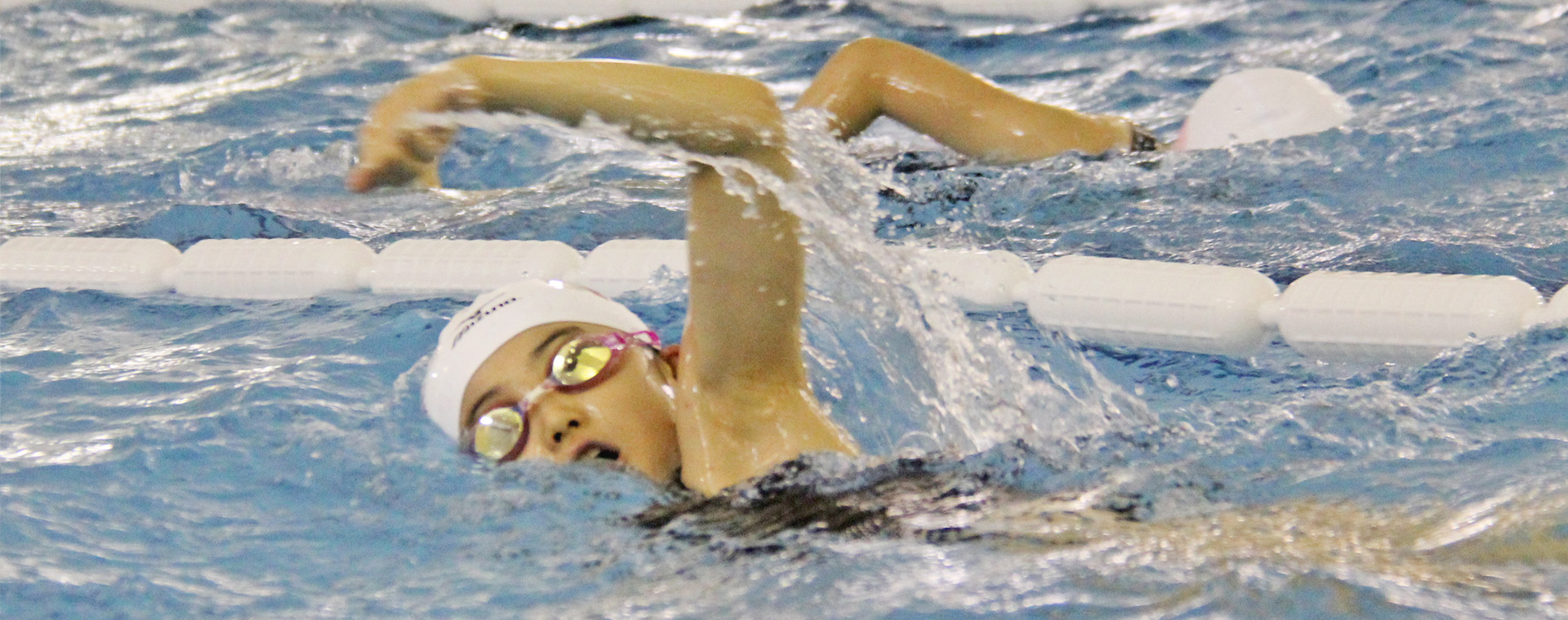 設備面においてはプールに昇降式の床を採用し、学年に応じた水深を設定することができます。1クラス分のドライヤーや、採暖室として完備されたサウナルームで健康面にも十分配慮しています。充実した環境のもと、6年間の成果は目を見張るものがあります。