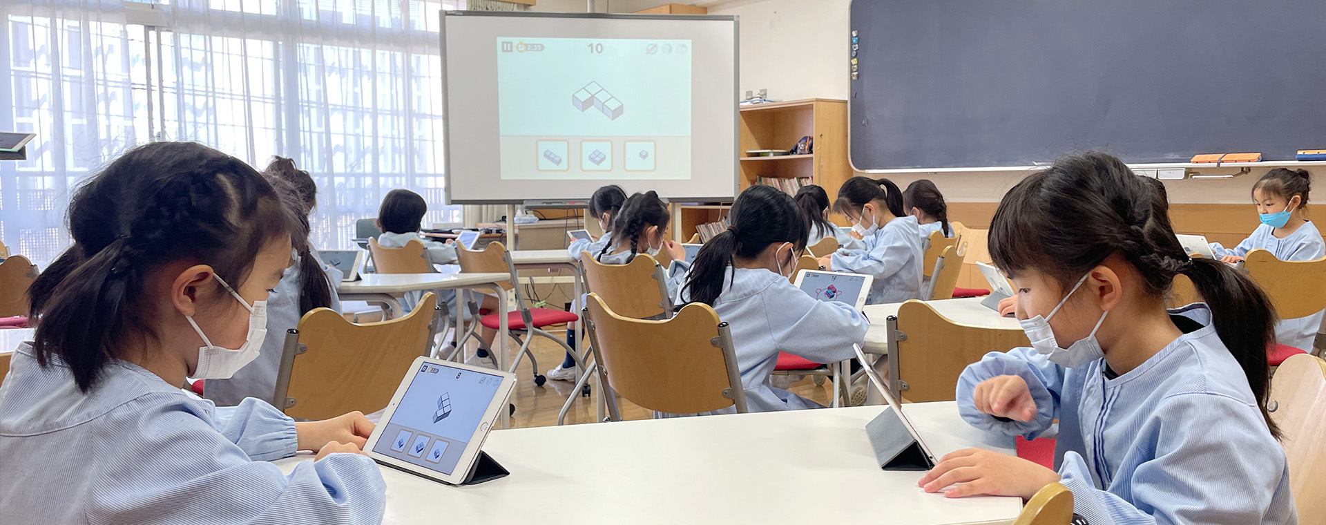 - 1年生からタブレット端末(iPad)を使用して、学習ツールとして使いこなす基本的なスキルを培います。3年生からの授業では、積極的にパソコンやiPadを使っています。描画やキーボードによる文章作成、生い立ちの記録をまとめたり、おすすめの本を紹介するなどの学習を積み重ね、修学旅行の調べ学習へと進めていきます。将来の様々な可能性を考えて、Officeの「Word] 「Excel」「PowerPoint」の使い方や、タイピング体験などにも、積極的に取り組んでいます。4年生になると一人1台のiPadを活用し、段階的にプログラミング的思考力が身に付くようなアプリや課題解決型ゲームソフトを取り入れ、チャレンジしています。