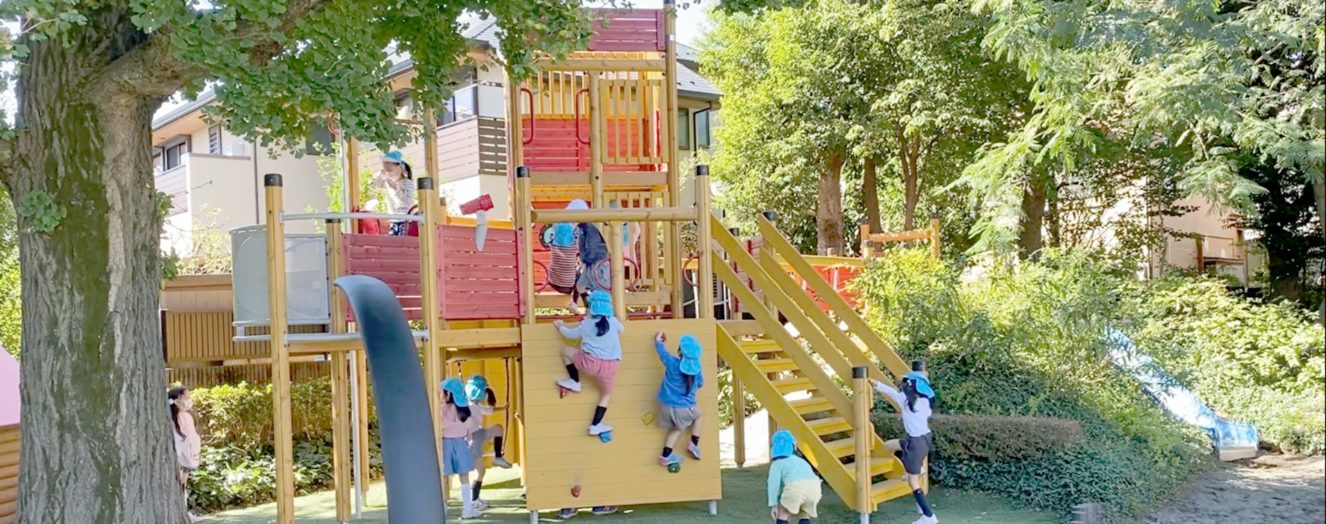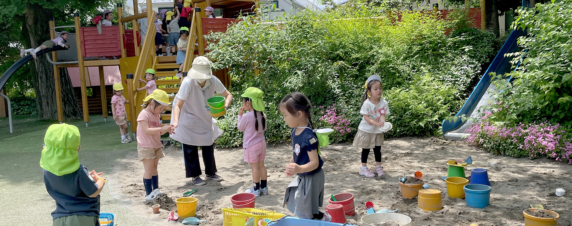子ども達は緑に囲まれた広い園庭で、虫探しやおままごと、探検など思い思いの遊びを展開します。鬼ごっこで走ったり、夏は水遊びを楽しんだり、体をいっぱい動かしてのびのびと遊びます。