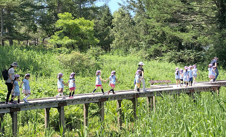 自然の中で思いやりの心を育てる豊かな自然に触れて生活し、2泊3日の集団生活を通して、何でもやってみようとする心と友だちを思いやる心を養います。