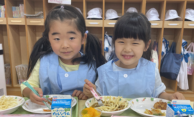 週4日実施している給食は、行事食や季節の食材を取り入れた献立(アレルギー対応可)で、厳選された素材を使用し、学園内で手作りしています。