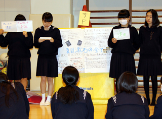 クラスの班毎に作者や作品、登場人物などについて調べ、最終の仕上げは全クラスが体育館に集まり、各発表を聞くことでいっそう深まりのある学習になりました。