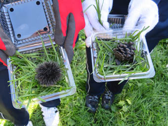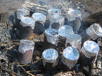 「まつぼっくり」または「いがぐり」を缶の中に入れ、蒸し焼きしました。