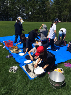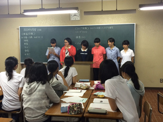 先生方に指導していただき、5つのワークショップから各自の選んだものを体験します。 午後のワークショップの開校式を行いました。