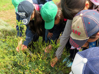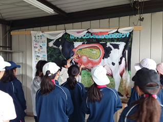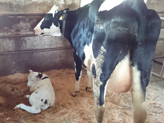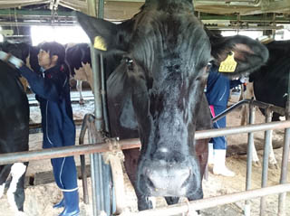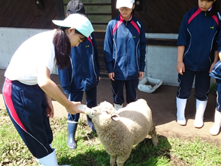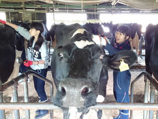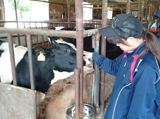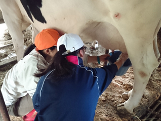 搾乳とブラッシング、昨夜産まれたばかりの仔牛を見学。その後、仔ヒツジに乳やり、ヤギのえさやりをしました。