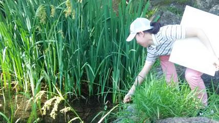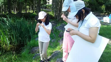 美術陶芸は、笹舟をつくって山荘前の池に…