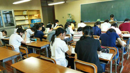 山荘到着後、お世話になる管理人の方にご挨拶をして、教室で富岡製糸場のまとめを行いました。