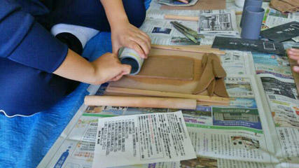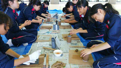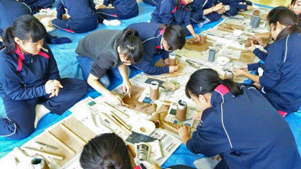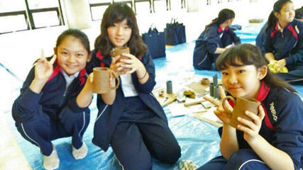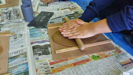 山荘内の体育館で陶芸体験、マグカップやお皿などを作ります。