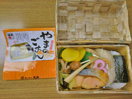 昼食は竹かごに梅、みそ、栗おこわの3種類のおにぎりが入ったお弁当をいただきました。