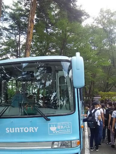 自然にやさしい電気バスに乗って工場見学に出発です。