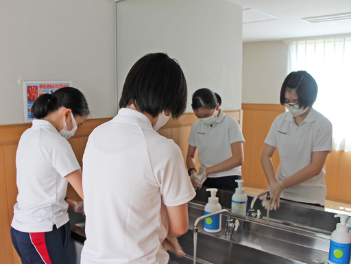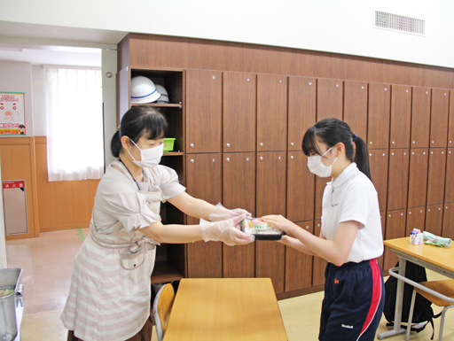 手を洗い、ランチョンマットを机の上に置いて、それぞれ準備ができた生徒から、担任の先生よりお弁当を受け取ります。