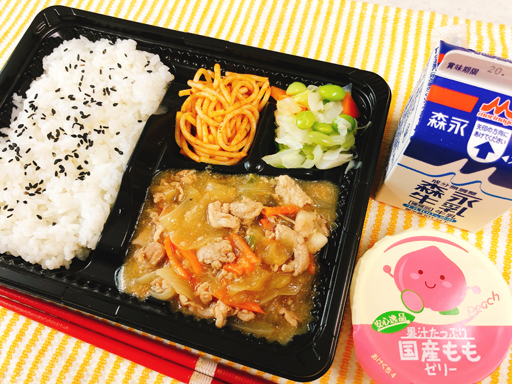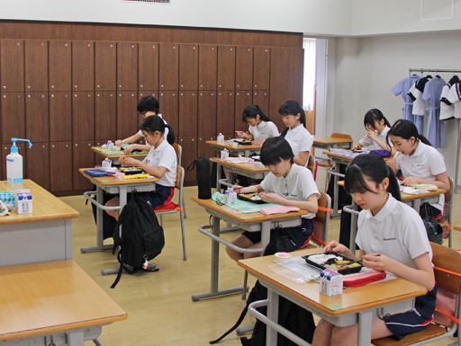 感染症対策のため、「安全・安心」を最優先に考えて会食室で調理した「パック入りのお弁当」を教室でいただきます。