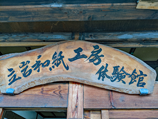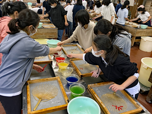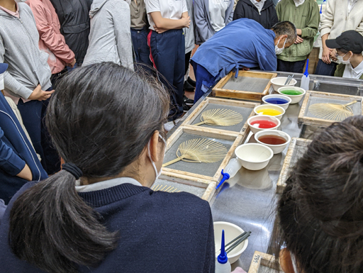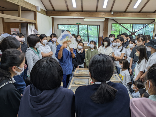 和紙の里に到着しました。作業の流れについて説明を聞いています。