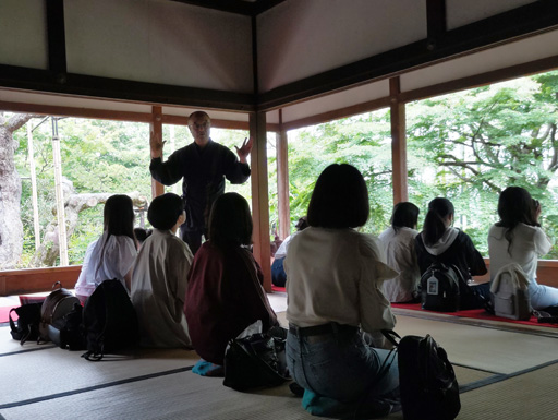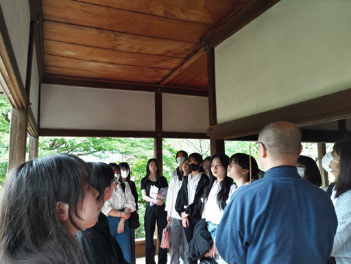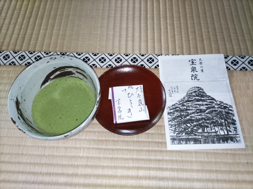 宝泉院でお寺の由来を伺いながらお菓子をお抹茶をいただきました。額縁の庭園はとても美しかったです。血天井の由来や戦国時代の武士のお話もしていただきました。