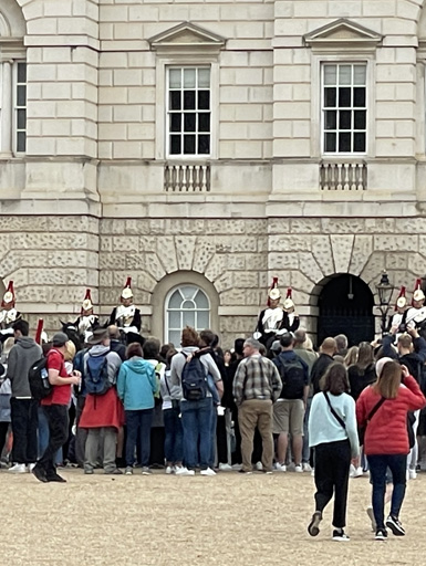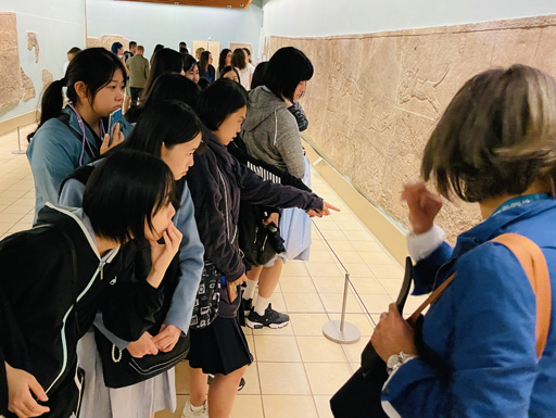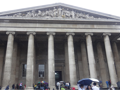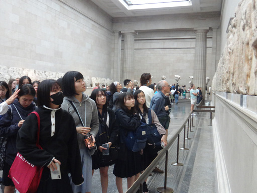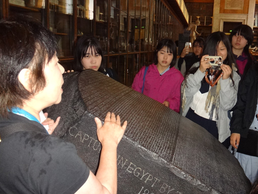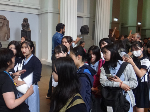午後は、大英博物館を見学しました。世界中の文化遺産が集結する巨大な博物館は、世界中からの観光客で大変な混雑で、進むのにも一苦労でした。2チームに分かれ、1時間はガイドさんが必見作品(ロゼッタストーンや人面有翼牡牛象、ニネベ・ライオン狩りのレリーフなど)を紹介してくださり、その後1時間自由見学となりました。