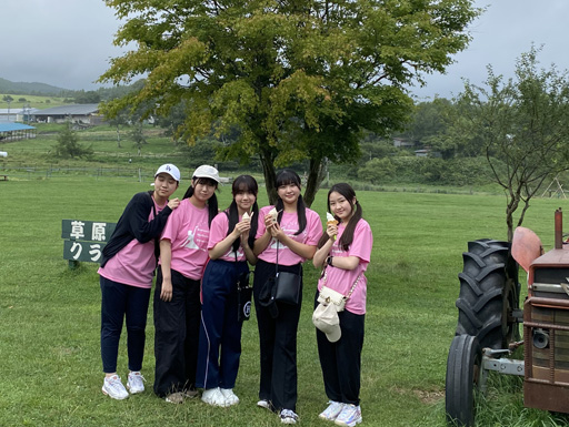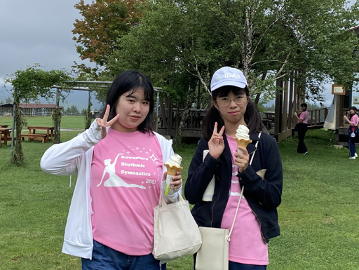 午前の前半は外出をしました。うっすらと霧のかかる長門牧場です。おそろいのTシャツで、いつ食べても美味しいソフトクリームと共に、可愛くポーズを決めて!