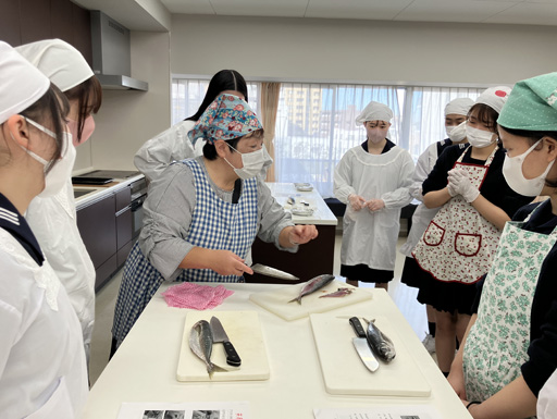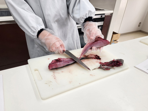 高校3年生の授業終了にあわせて、特別授業が開講されました。家庭科室では「アジの三枚おろし」の実習が行われました。