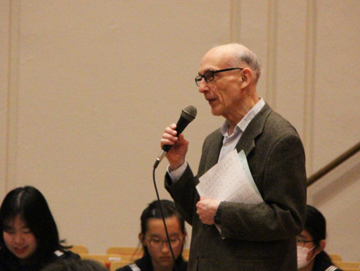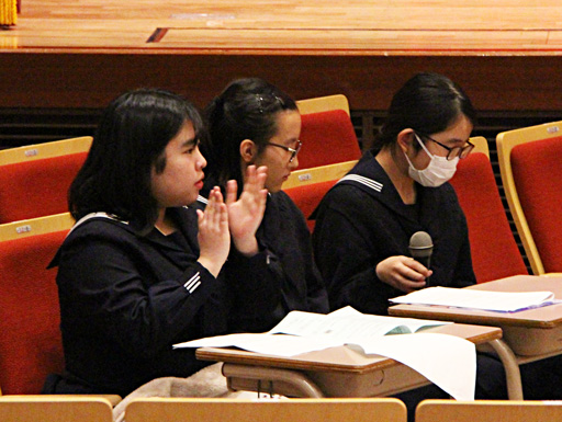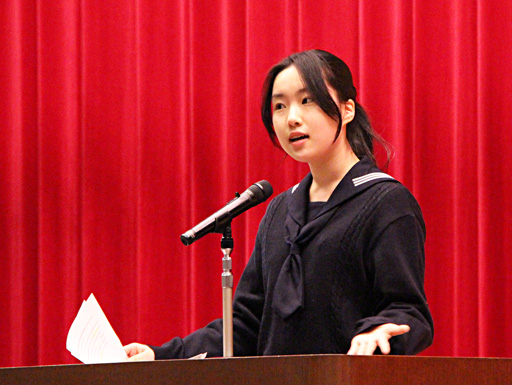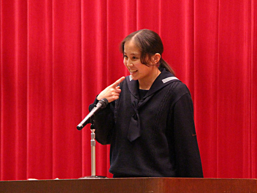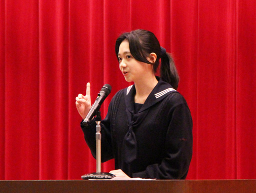 選ばれた中学生9名と高校生7名が、英語で関心を持っているテーマについてスピーチを行いました。緊張の中にも、手振りをまじえて堂々と自分の考えを話すことができました。最後にネイティブの先生から総評をいただきました。