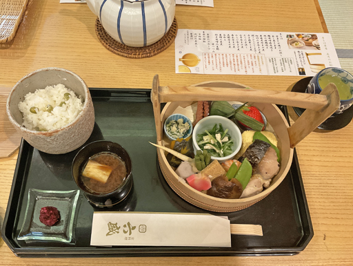 昼食は人間国宝手作りの器に入った「手をけ弁当」をいただきました。