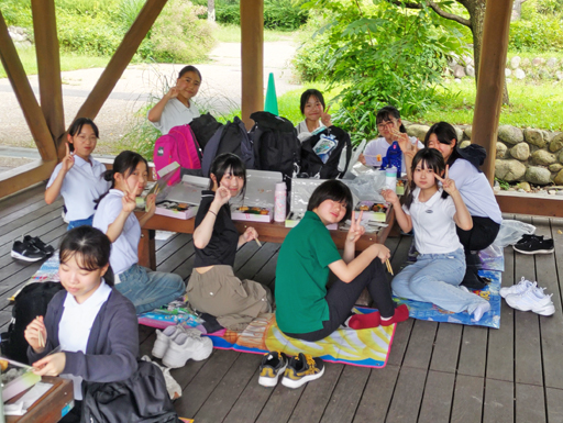 大自然の中で写生会です。あづみのの扇状地は豊富に地下水が湧き出て流れており、その水音の中、ゆったりと写生を進めることができました。