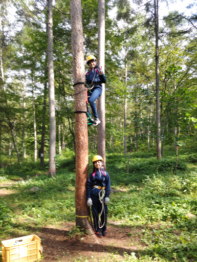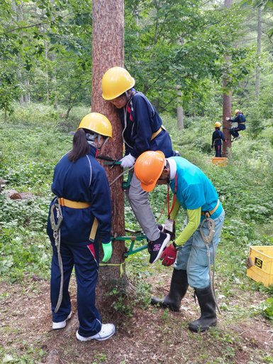 林業では、木登り補助具「のぼったろう」を使って、高い所まで上ることができました。枝打ち作業の大切さと大変さを学びました。