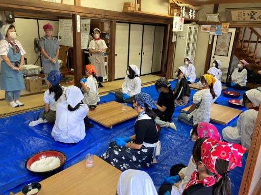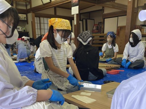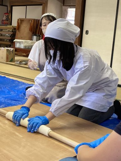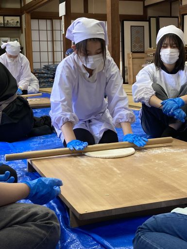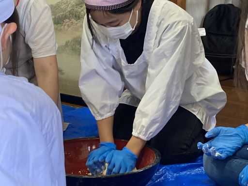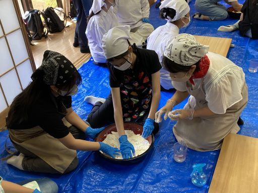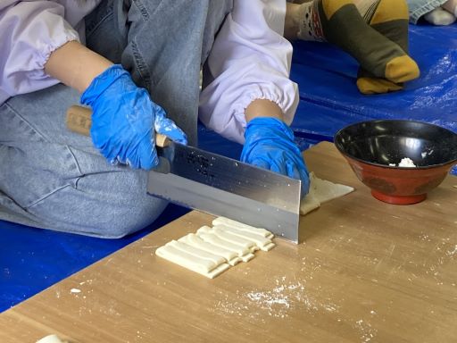 小麦粉に水を加えて、よくこねます。耳たぶくらいの固さになるようにと言われたので、しっかり体重をかけて交代でこねました。