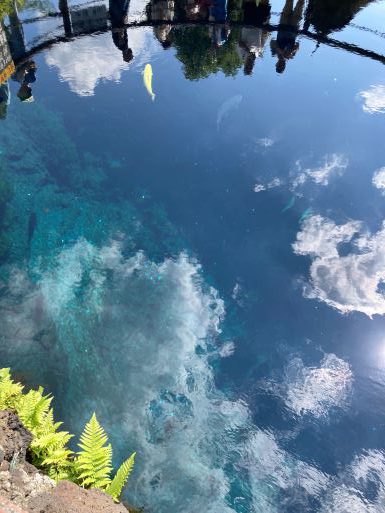 鏡池はその名の通り。澄んだ池の水を撮影したら、雲が浮かぶ青空に魚が泳いでいるようでした。