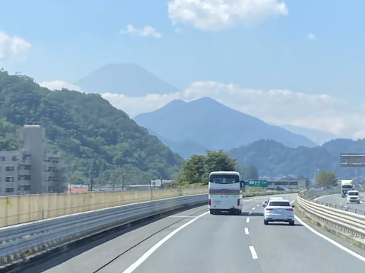一路、山梨県忍野村へ。前方にはうっすらと富士山が見えてきました。