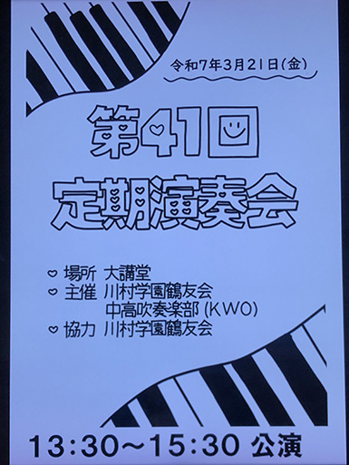 NEWS TOP NEWS 吹奏楽部 第41回定期演奏会 2025.03.28 吹奏楽部 第41回定期演奏会 令和7年3月21日(金) 吹奏楽部による定期演奏会が行われました。毎年春に行われるこの演奏会のため、全13曲、冬休みや家庭学習日も登校して懸命に練習しました。 前の記事へ 次の記事へ 一覧に戻る 年代別 すべて 2025 2024 2023 2022 2021 2020 2019 2018 2017 2016 2015 2014 入試情報一覧