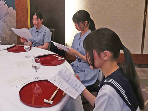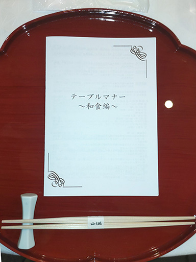 講師の先生からお料理の説明をうかがいました。特に「箸」の上げ下げについて意識していただきます。