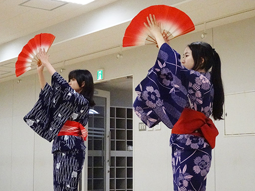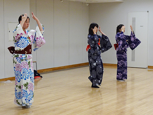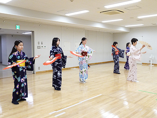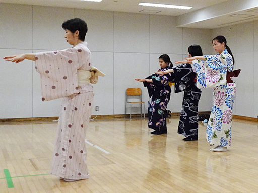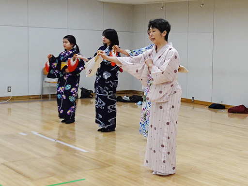 浴衣に着替え、先生のお手本を見ながら、扇の扱い方やしなやかな動きを習得しています。