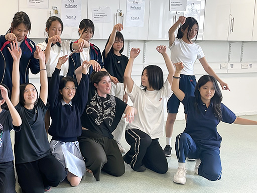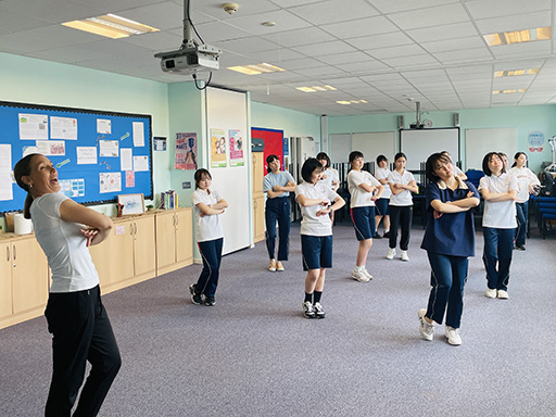 午後は、ドラマとダンスのレッスンを受けました。皆で協力して天気が変わる様子を音と動きで表現したり、いろいろなステップを学び音楽に合わせてダンスをしたりしました。「想像力豊かで、かつ積極的で素晴らしい」と先生からお褒めの言葉をいただきました。