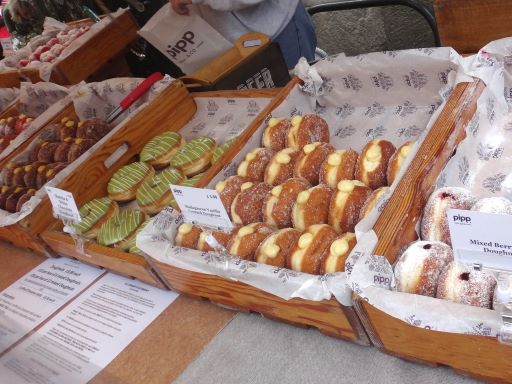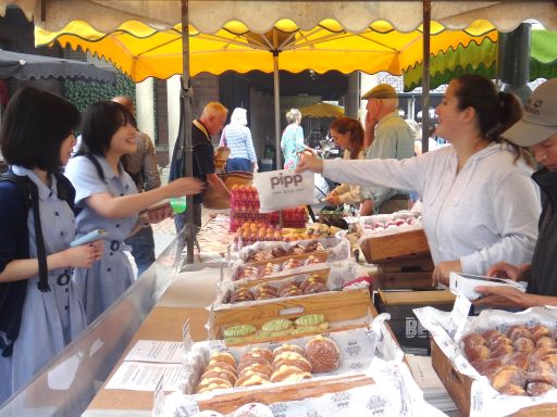 午前中は、毎週土曜日に開催されるファーマーズマーケットへ行きました。多くの人で賑わう中、地元の方の作ったはちみつやオリーブなどの味見をしたり、おいしいドーナツを食べました。