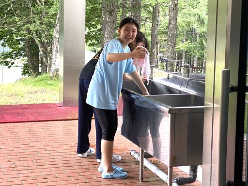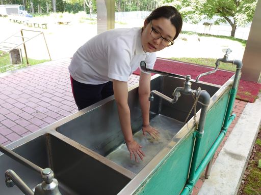 養護の先生が用意してくださった水槽に手を浸しています。運動部の熱中症対策。冷たい水が、気持ちいーい!すぐにクールダウンできました。