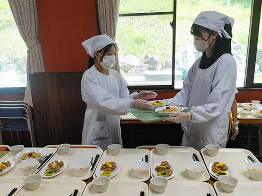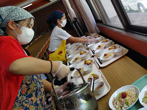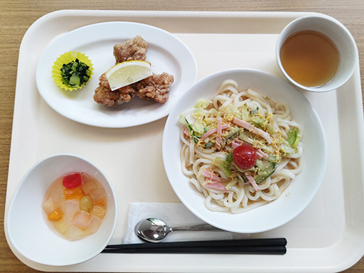 昼食は、夏サラダうどんです。会食当番はバスケットボール部です。